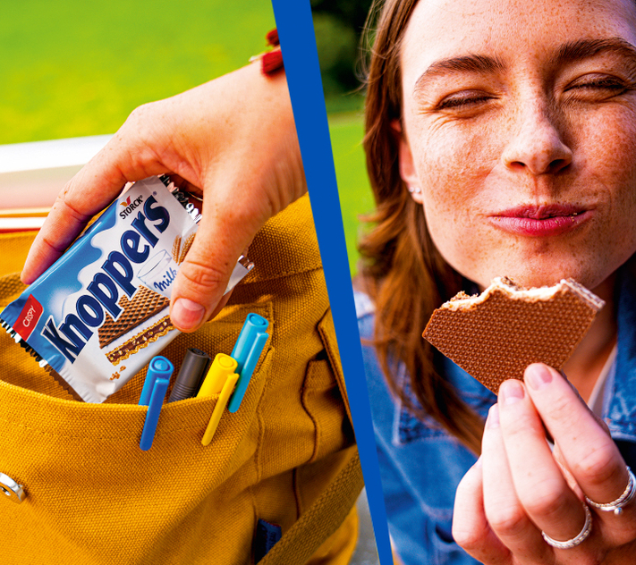 Au travail, à l’école ou sur la route, rien de tel qu’une pause détente avec un délicieux Knoppers: cette gourmandise légère et croustillante (dont les 2 couches de gaufrettes sont délicatement fourrée de lait et de pâte de noisettes fondante, rehaussée de noisettes grillées croquantes) est le meilleur des en-cas gourmands !